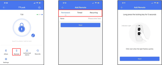 This lock supports unlocking with a remote controller. Before using the remote, it needs to be added first. You need to perform the adding process while you are near the lock. The validity period of the remote can be set, it can be permanent or timed.